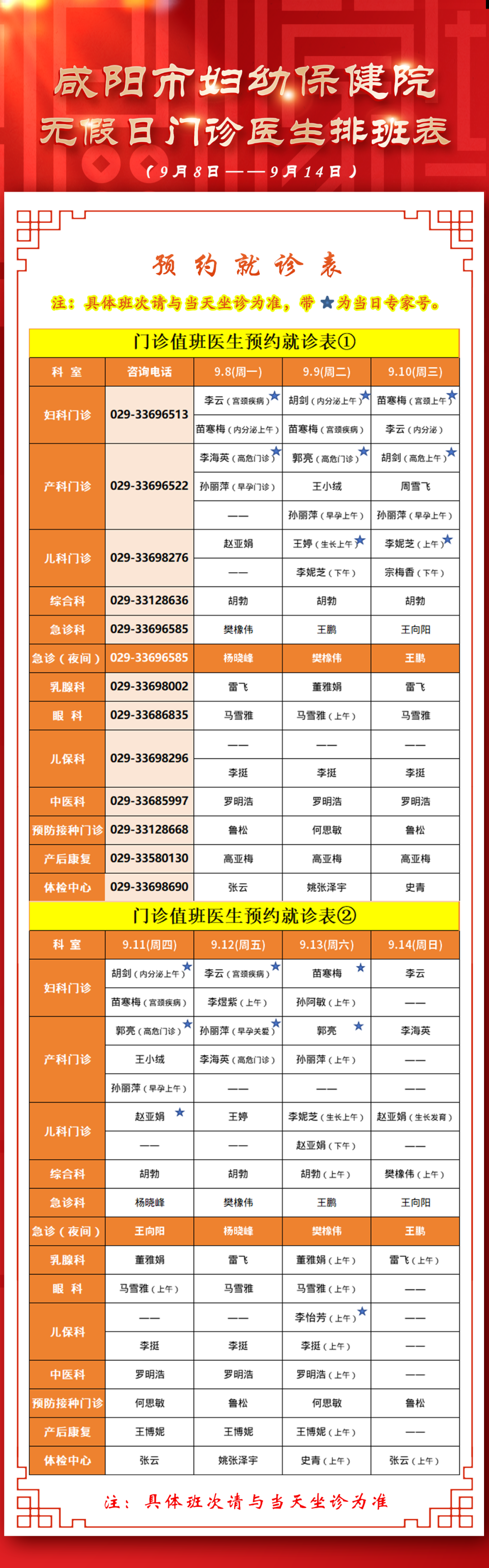 咸陽(yáng)市婦幼保健院無(wú)假日門(mén)診醫(yī)生排班表(9月8日-9月14日)