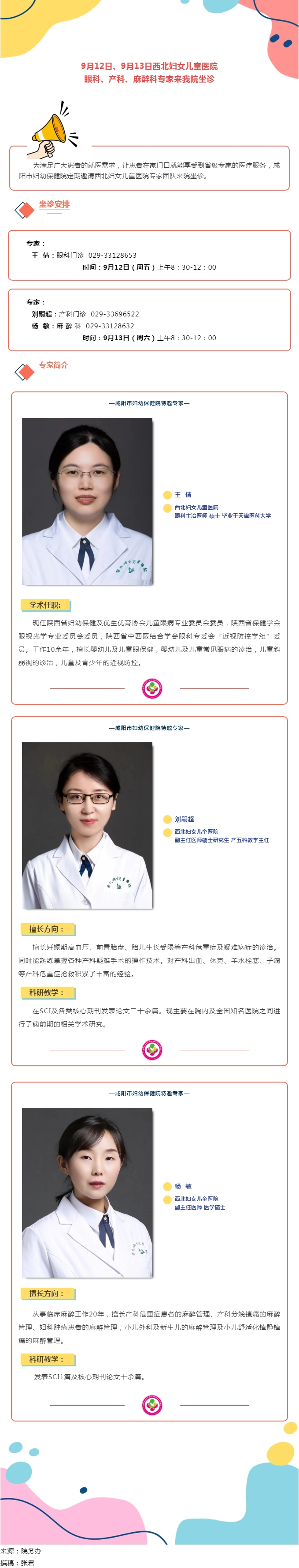 9月12日、9月13日西北婦女兒童醫(yī)院眼科、產(chǎn)科、麻醉科