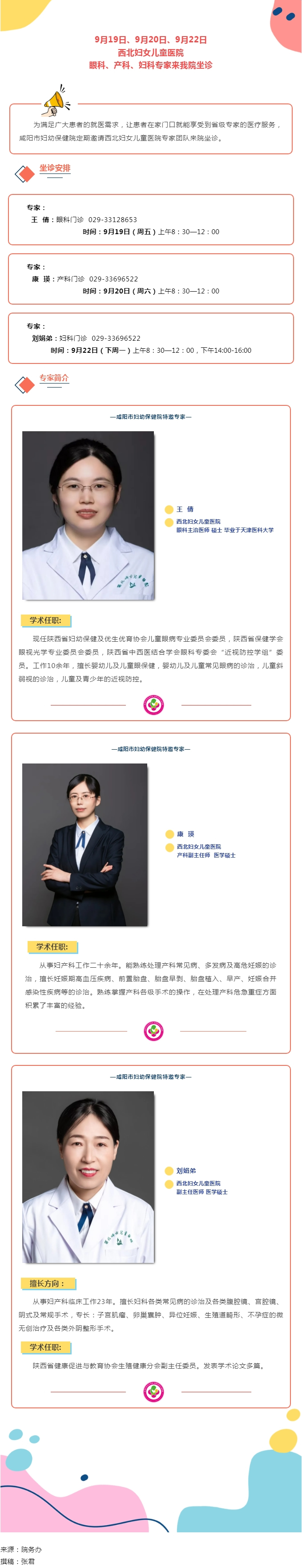 9月19日、9月20日、9月22日西北婦女兒童醫(yī)院眼科、產(chǎn)科、婦科專家來我院坐診