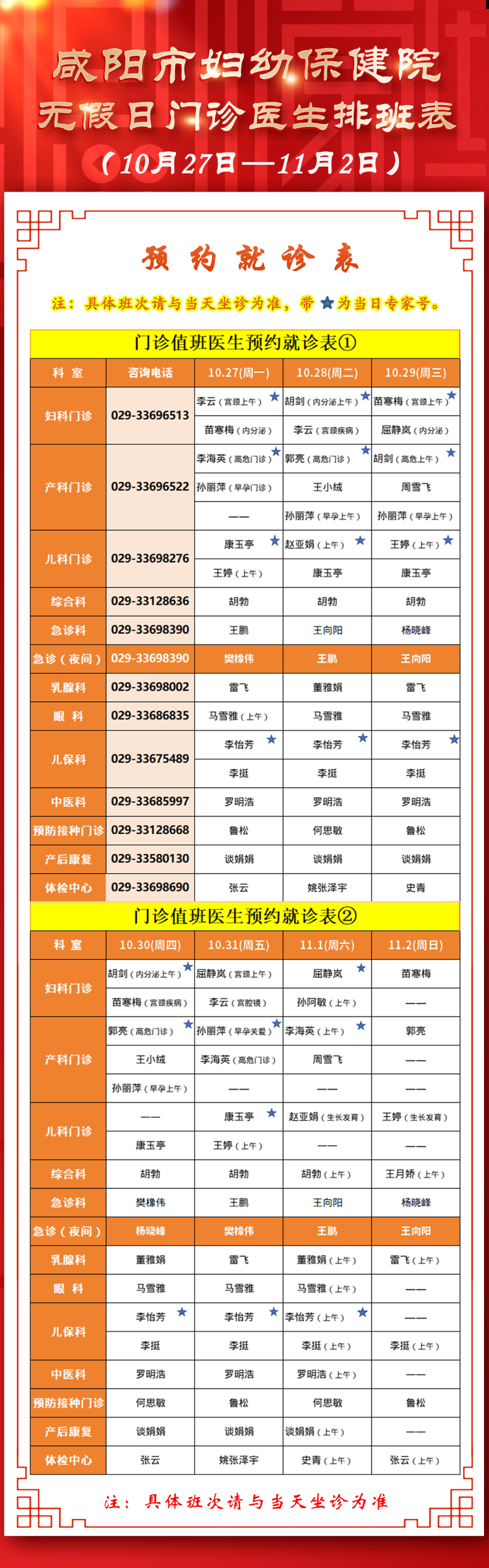 咸陽市婦幼保健院無假日門診醫(yī)生排班表(10月27日-11月2日)