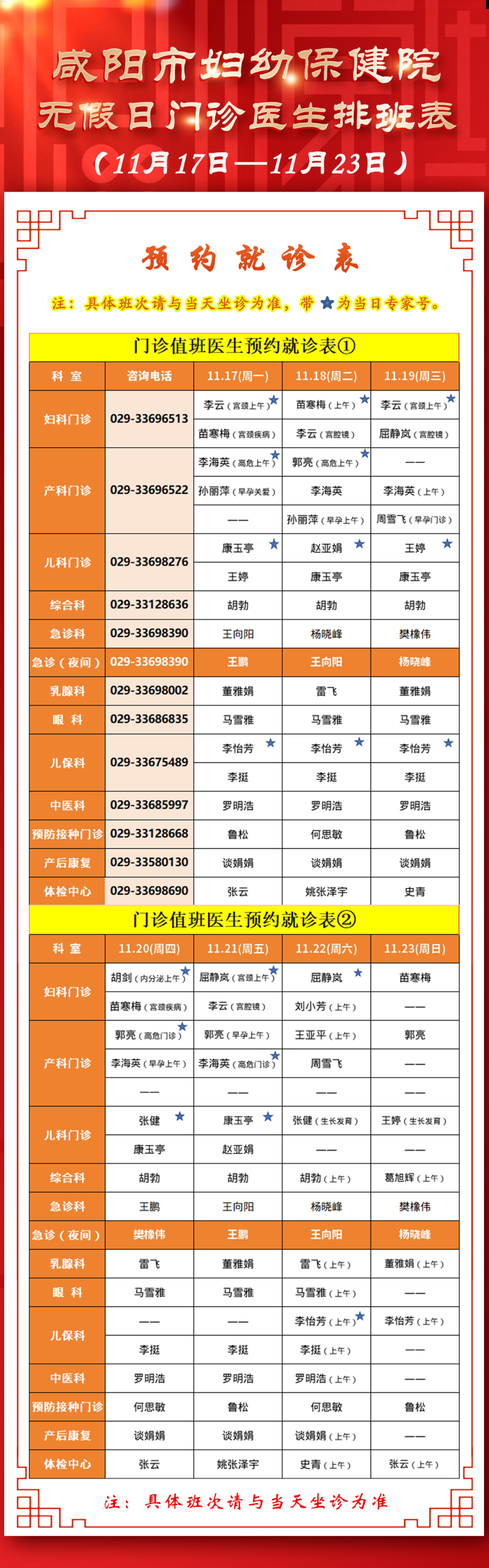 咸陽市婦幼保健院無假日門診醫(yī)生排班表(11月17日-11月23日)