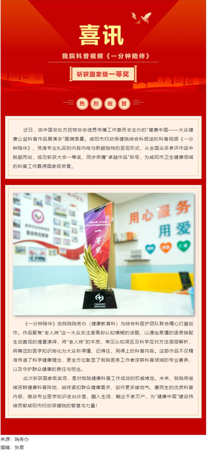 喜訊!我院科普視頻《一分鐘陪伴》斬獲國家級(jí)一等獎(jiǎng)
